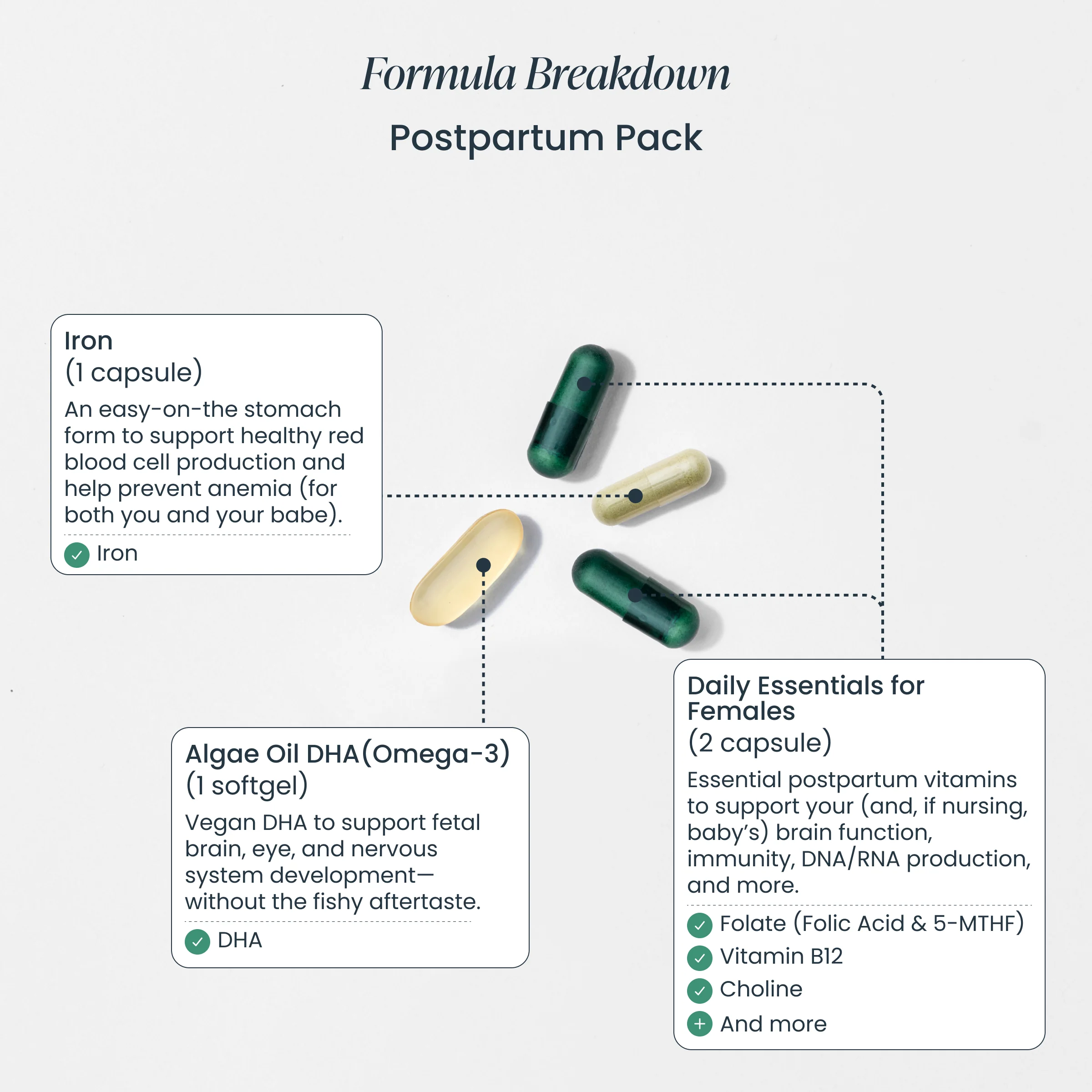- Postpartum Pack: Fuel your fourth trimester with B-vitamins (for energy), Vitamins A, C, E, and Selenium (for immunity), Choline (for focus and memory), and more